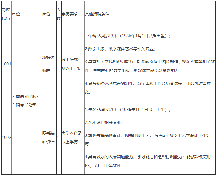 2021年云南晨光出版社有限责任公司计划公开招聘工作人员2名,具体招聘岗位信息及条件要求如下: