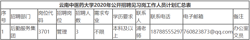 (一)岗位及条件:详见附件《云南中医药大学后勤服务集团2020年公开招聘见习岗工作人员计划汇总表(第四批)》。