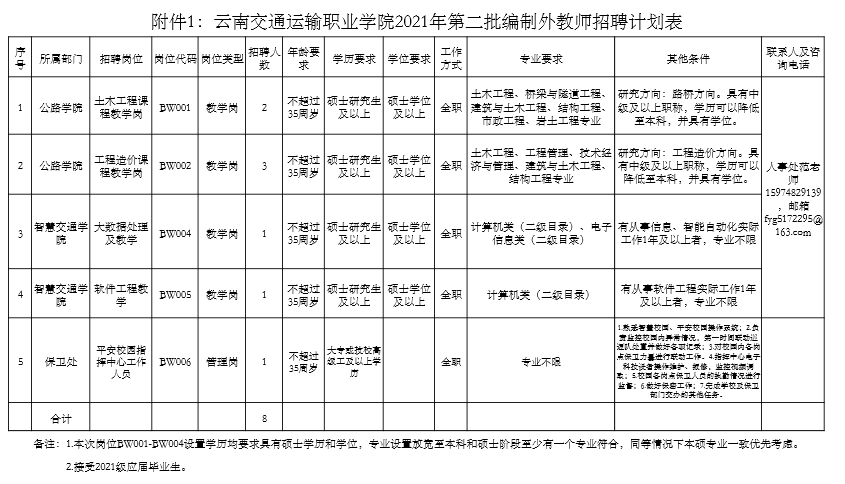 招聘岗位、专业及相关要求详见《云南交通运输职业学院2021年第二批编制外教师招聘计划表》(附件1)和2020年云南省公务员考试专业目录(附件3)。报名时间:2021年3月27日8:00至4月4日18:00。