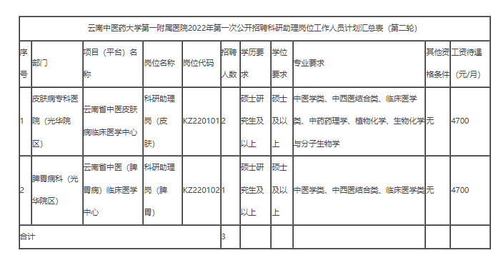 详见附件:《云南中医药大学第一附属医院2022年第一次公开招聘科研助理岗位工作人员计划汇总表》