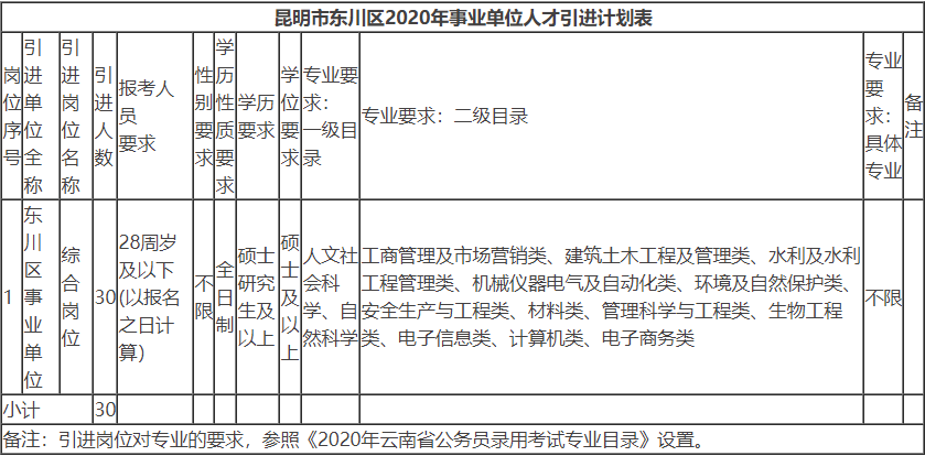 东川区2020年事业单位人才引进计划(不含参照公务员法管理事业单位)共计30名。具体岗位详见附件1。