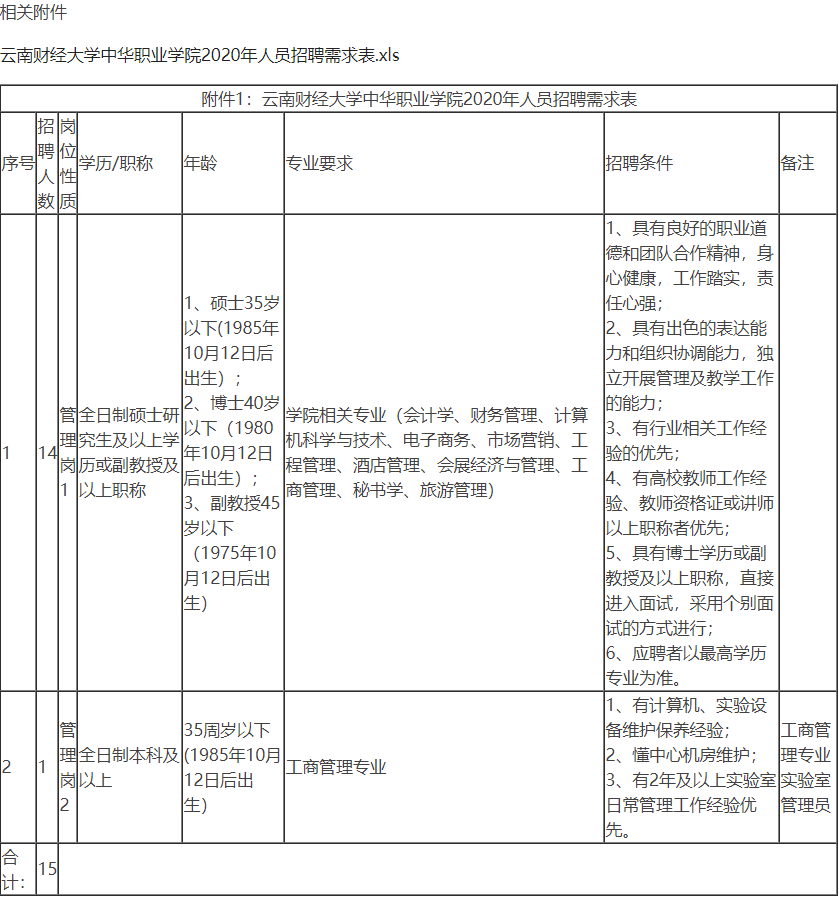 管理岗(招聘条件详见附件1《云南财经大学中华职业学院2020年人员招聘需求表》)。