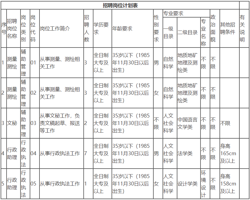 本次招聘工作人员分为测量测绘、文秘、行政助理3个岗位共计16人(详见招聘岗位计划表)