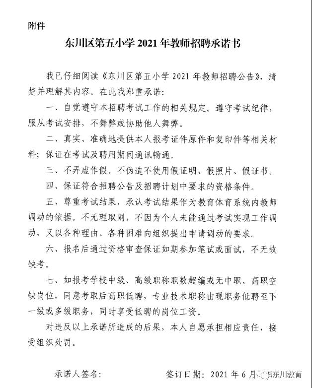 (一)区教育体育局要督促各学校提高政治站位,充分认识本次教师招聘的重要意义,不得以任何形式,设置任何条件,阻止本校符合报考条件的教师报考东川区第五小学。