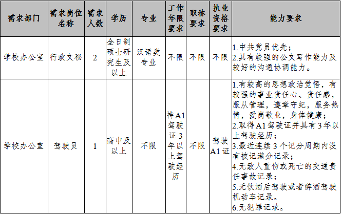 为适应学校发展的需要,需面向社会诚聘2名行政人员及1名驾驶员,现将有关事项公告如下: