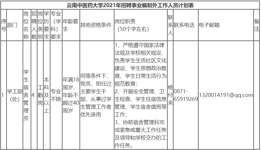 云南中医药大学学生宿舍管理人员4名,具体详见附件。
