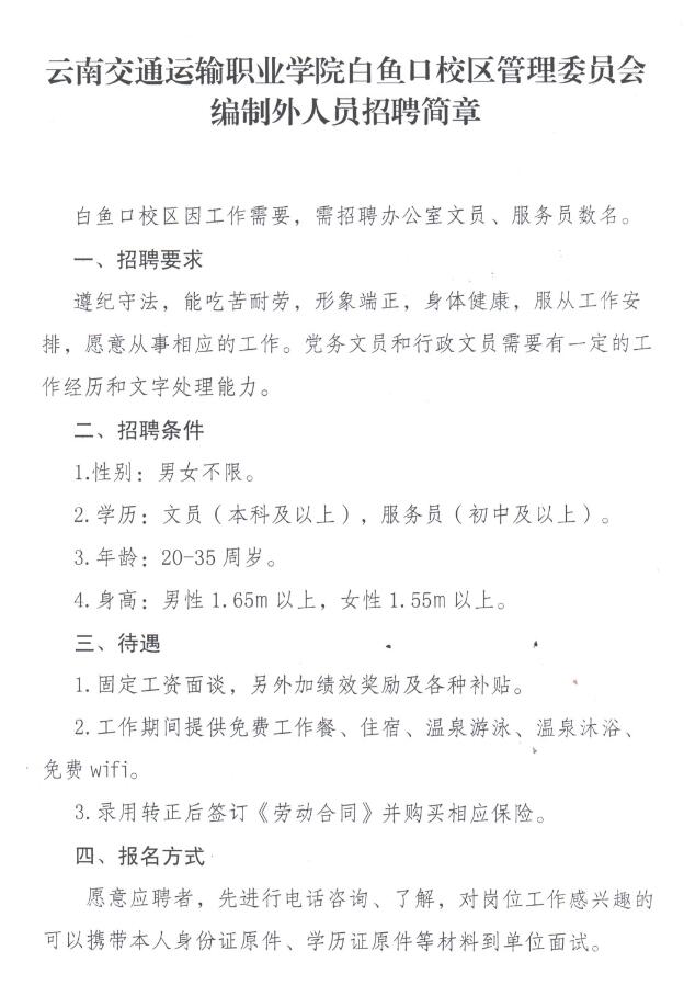 云南交通运输职业学院白鱼口校区管理委员会编制外人员招聘简章