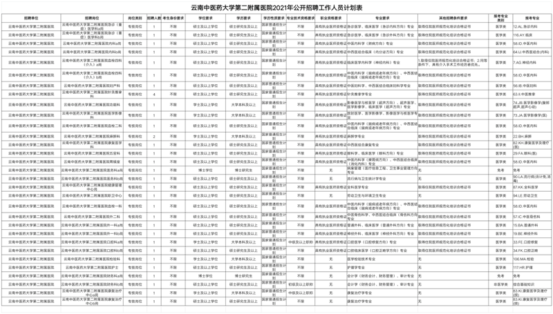 根据《云南省事业单位公开招聘工作人员办法》(云人社发〔2016〕182号)等有关文件规定,经省人力资源和社会保障厅批准,云南中医药大学第二附属医院2021年面向社会公开招聘35名编制内工作人员。招聘公告详见附件1。