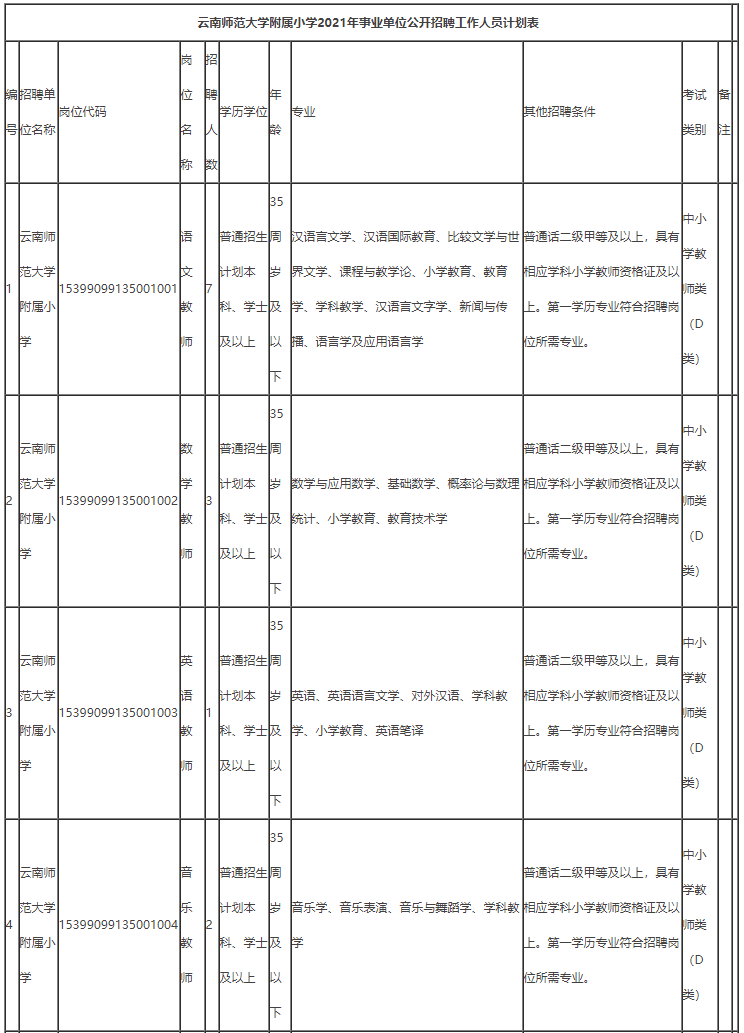 根据《云南省事业单位公开招聘工作人员办法》(云人社发〔2016〕182号)等有关文件规定,结合工作需要,经云南省人力资源和社会保障厅批准,云南师范大学附属小学2021年计划面向社会公开招聘工作人员20名,现将有关公告事宜公告如下: