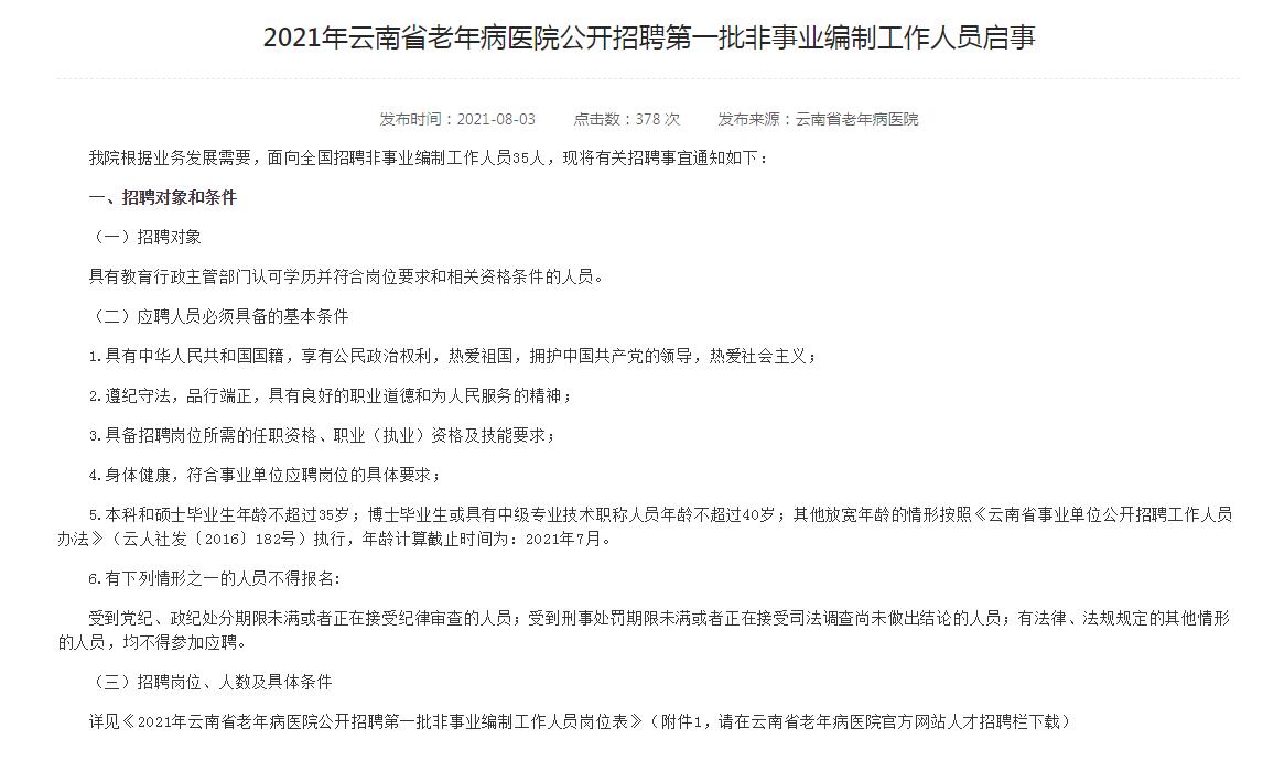 2021年云南省老年病医院 公开招聘第一批非事业编制工作人员启事