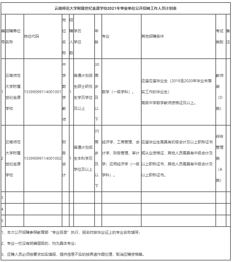 (一)云南省教育厅直属事业单位云南师范大学附属世纪金源学校公开招聘工作人员2名;
