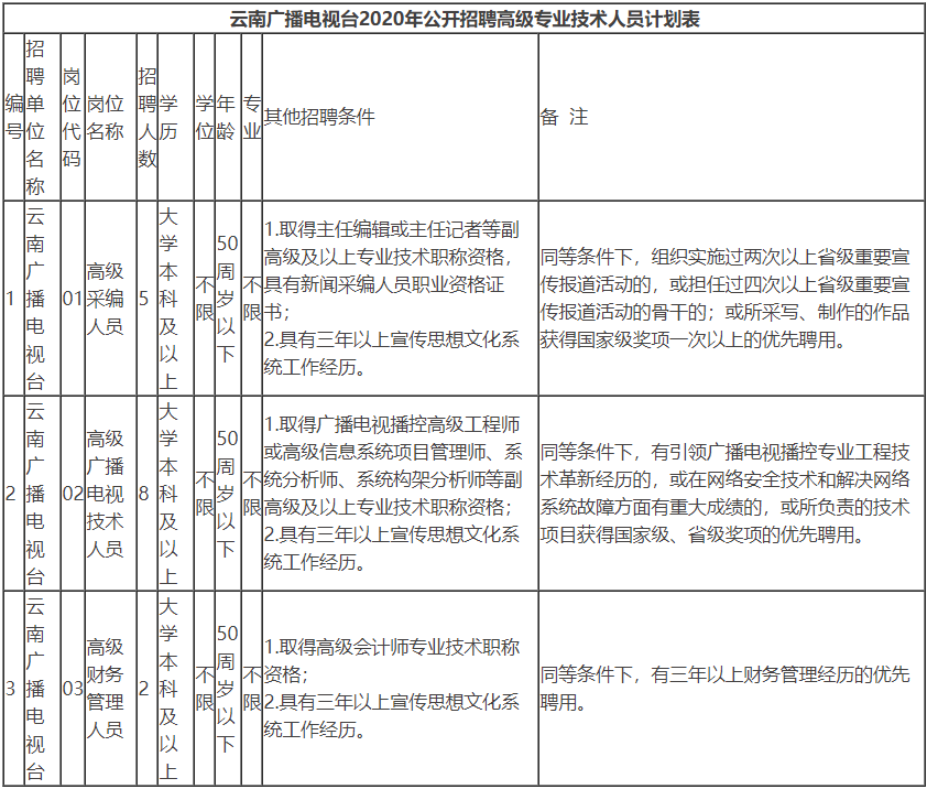 根据《云南省事业单位公开招聘工作人员办法》(云人社发〔2016〕182号)等有关文件规定,结合工作需要,经云南省人力资源和社会保障厅批准,云南广播电视台2020年计划面向社会公开招聘15名高级专业技术人员,现将有关事宜公告如下: