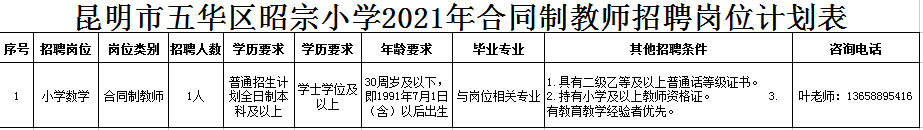 昆明市五华区昭宗小学位于昭宗路109号(森林湖小区旁),地处“省级精神文明示范村”——昭宗彝族村。源于清同治年间的义学,是一所有着146年历史的学校。现在因学校发展需要,面向社会招聘1名合同制教师,诚邀您的加入!