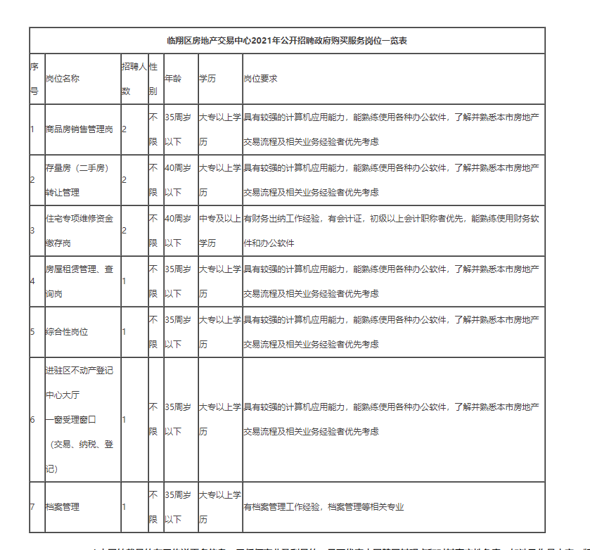 详见《临翔区房地产交易中心2021年公开招聘政府购买服务岗位一览表》(附件1)。
