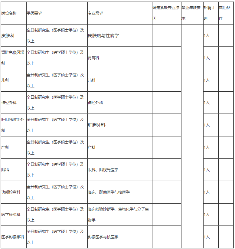 引进岗位10名,其中皮肤科1名、肾脏免疫风湿科1名、儿科1名、神经外科1名、肝胆胰微创外科1名、产科1名、眼科1名、功能检查科1名、医学检验科1名、医学影像学科1名。