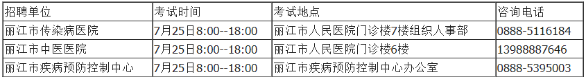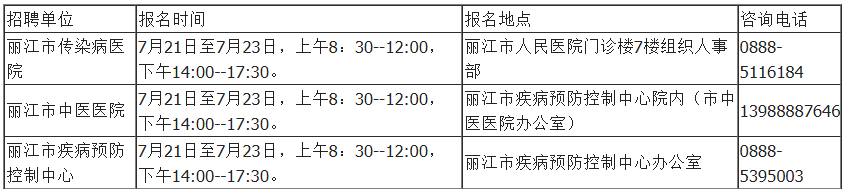 丽江市人民医院(丽江市传染病医院)招聘17人,丽江市中医医院招聘4人,丽江市疾病预防控制中心3人,以上三个单位的招聘岗位、名额和具体条件详见附件(各单位招聘岗位表)。