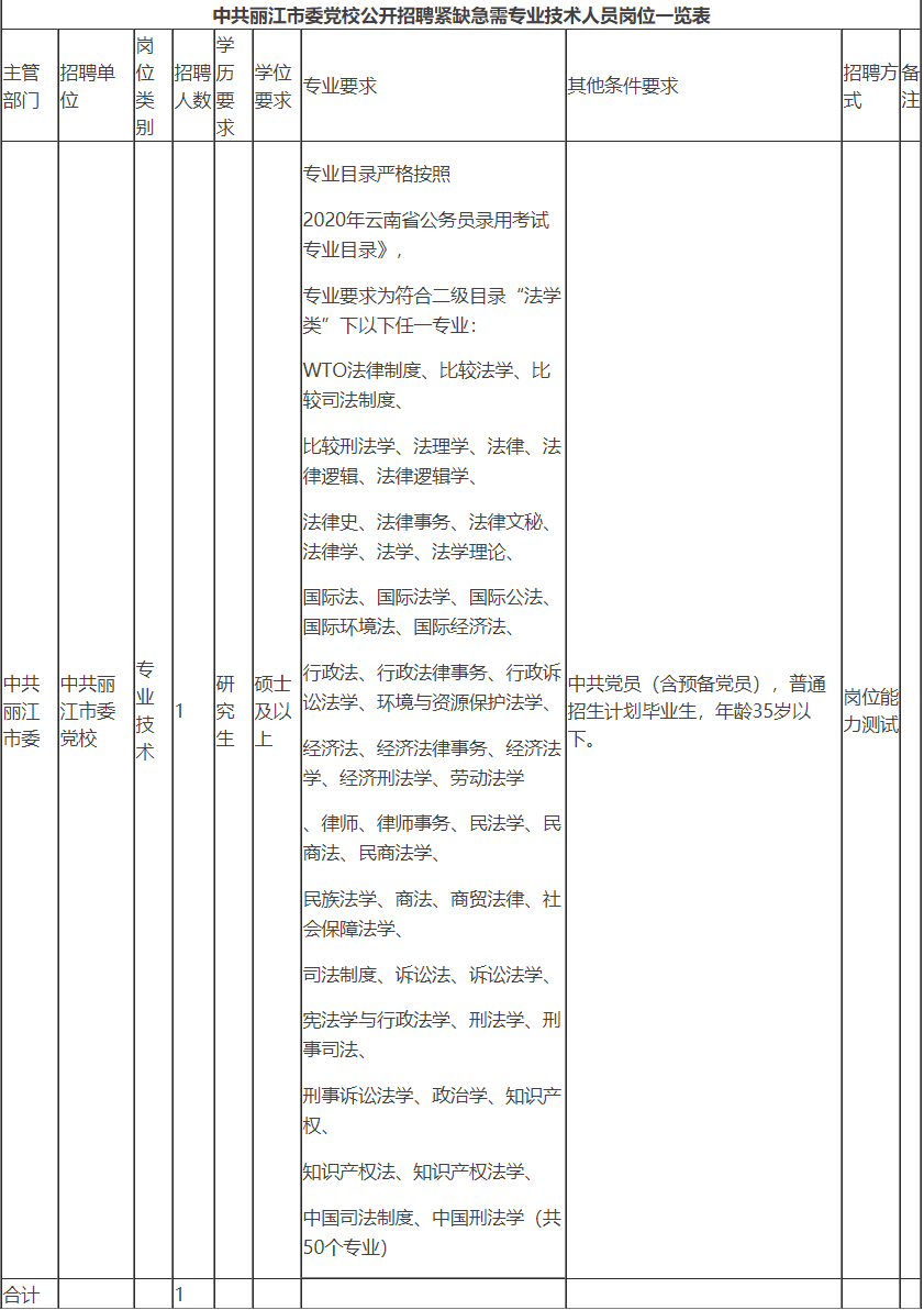 招聘岗位:专业技术人员(教师)1名,具体为法学教师,专业目录严格按照《2020年云南省公务员录用考试专业目录》。招聘岗位、名额、条件详见《中共丽江市委党校公开招聘紧缺急需专业技术人员岗位一览表》(见附件)。