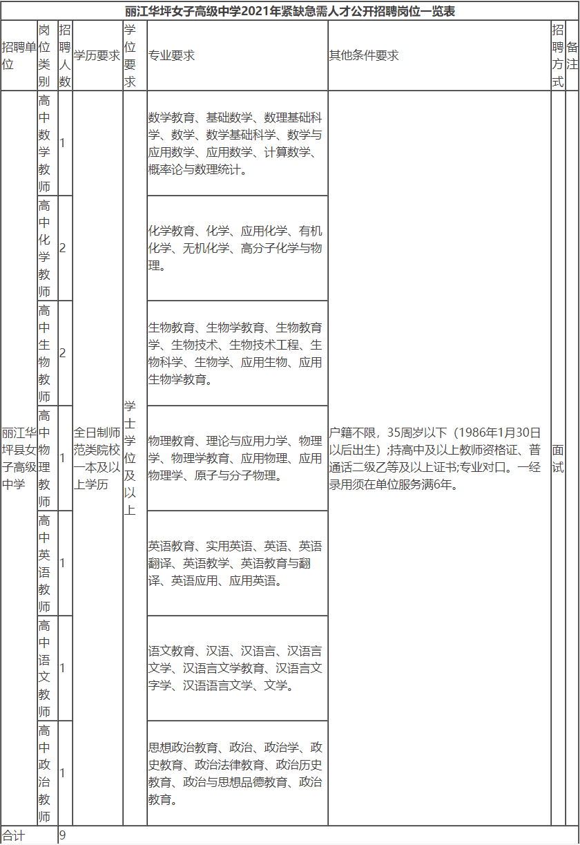为进一步提高丽江华坪女子高级中学人才培养、科学研究和服务社会的能力,建设高水平女校,根据《云南省事业单位公开招聘工作人员办法》《关于进一步规范丽江市事业单位紧缺急需工作人员招聘的通知》等有关规定,面向全国招聘紧缺急需专业技术人才9名,现将有关事项公告如下如下: