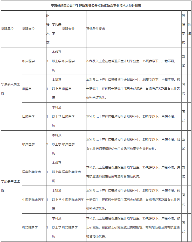 招聘岗位、名额、条件具体见《宁蒗彝族自治县卫生健康系统公开招聘紧缺需专业技术人员计划表》(附件1)。