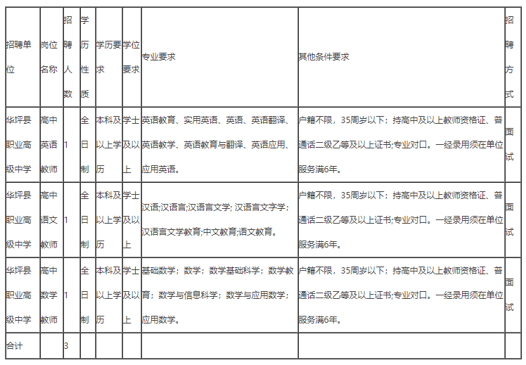 (一)招聘岗位:高中语文教师1人、数学教师1人、英语教师1人。
