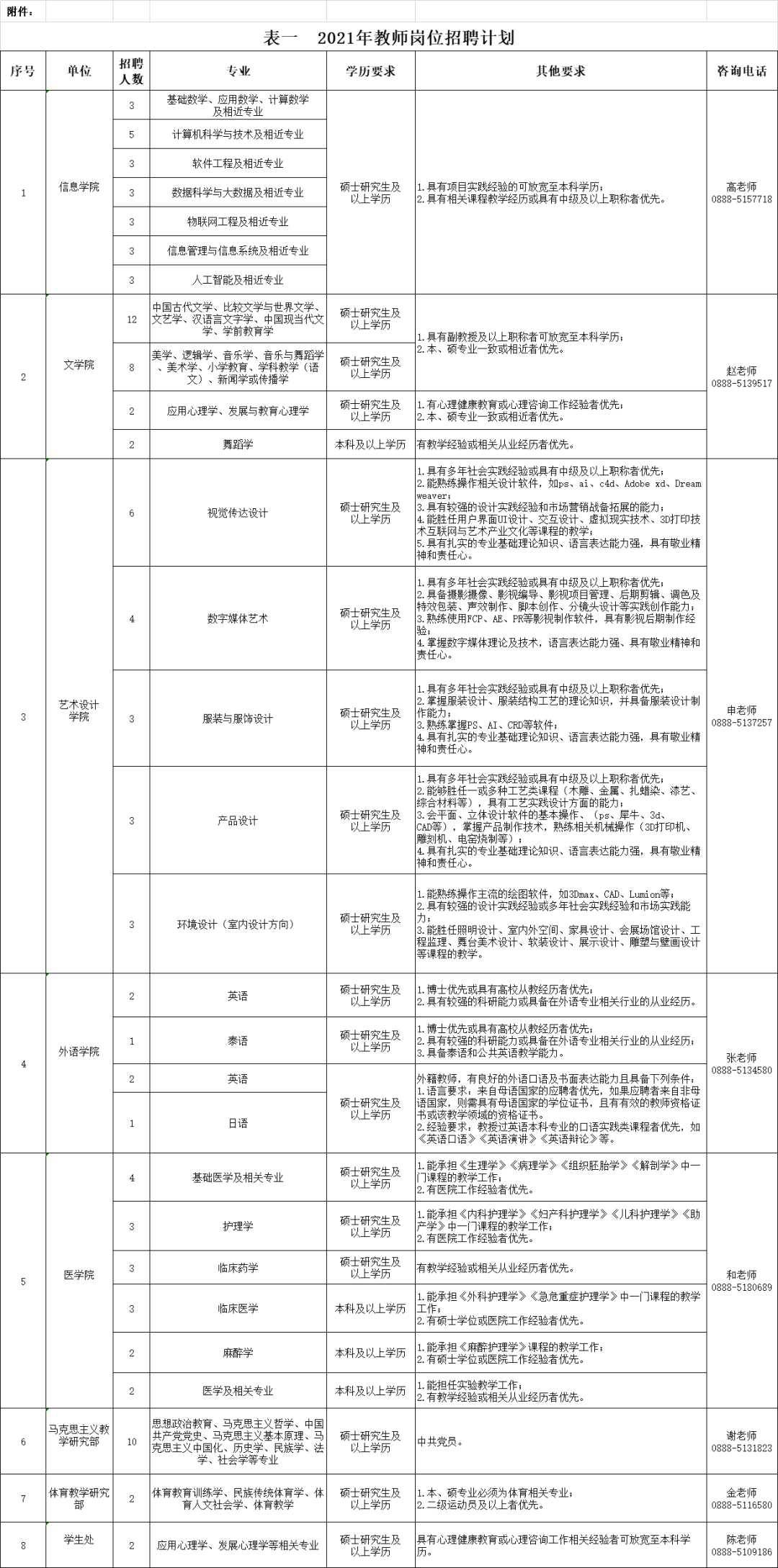 2021年计划招聘专任教师103人,辅导员6人,校医室医生2人,图书馆采编人员3人。详见招聘计划。