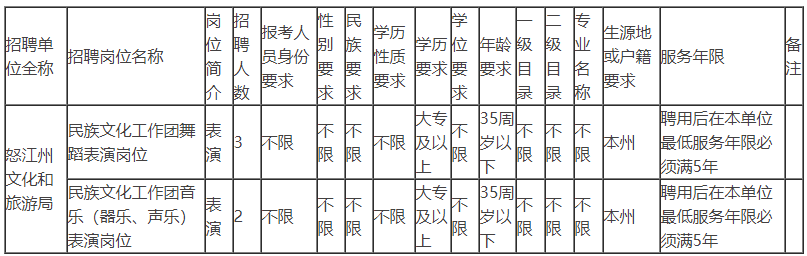 怒江州民族文化工作团舞蹈演员3名、音乐演员2名。具体岗位及要求详见下表: