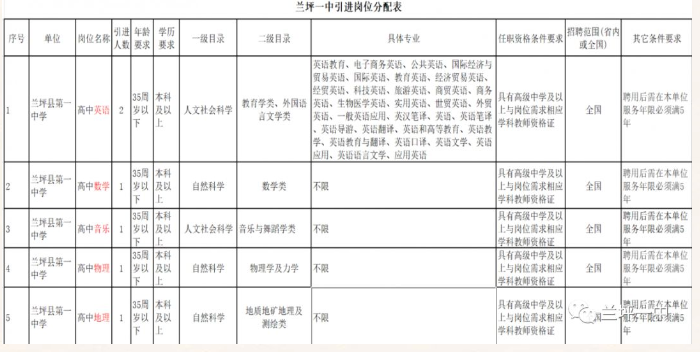 我校拟招聘高中英语教师2名、数学教师1名、音乐教师1名、物理教师1名、地理教师1名,共计6名教师。具体招聘条件附下表: