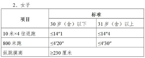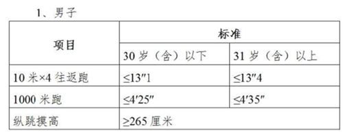 资格审核合格的人员进入体能测试,体能测试按照公安部《关于印发公安机关录用人民警察体能测评项目和标准(暂行)的通知》及其所附标准开展。体能测试的项目如下: