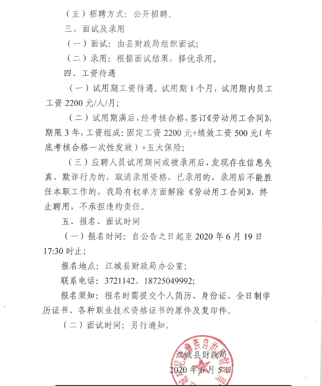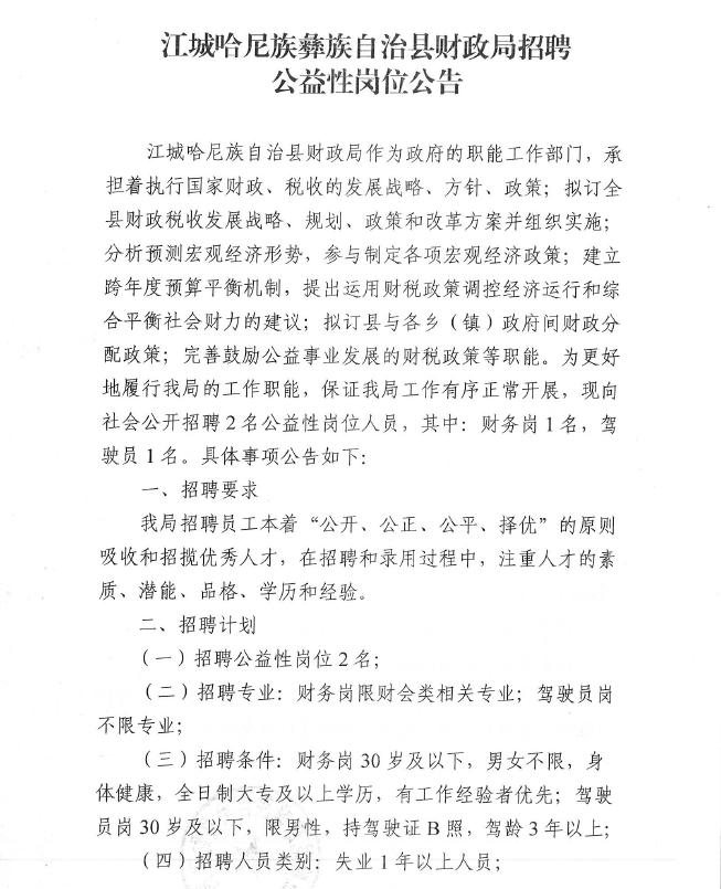 普洱市江城县财政局2020年招聘公益性岗位公告