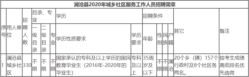为贯彻“六保”要求,落实“六稳”工作,根据《中共云南省委组织部 云南省人力资源和社会保障厅 云南省民政厅 云南省教育厅 云南省财政厅关于设置城乡社区服务岗位引导和鼓励高校毕业生到城乡社区服务的通知》(云人社通〔2020〕148号)文件精神,结合澜沧县行政村(社区)服务岗位的需求,经澜沧县城乡社区服务岗位引导和鼓励高校毕业生到城乡社区服务工作领导小组研究决定,澜沧县2020年计划招聘城乡社区服务工作人员330名。现将有关事项公告如下:
