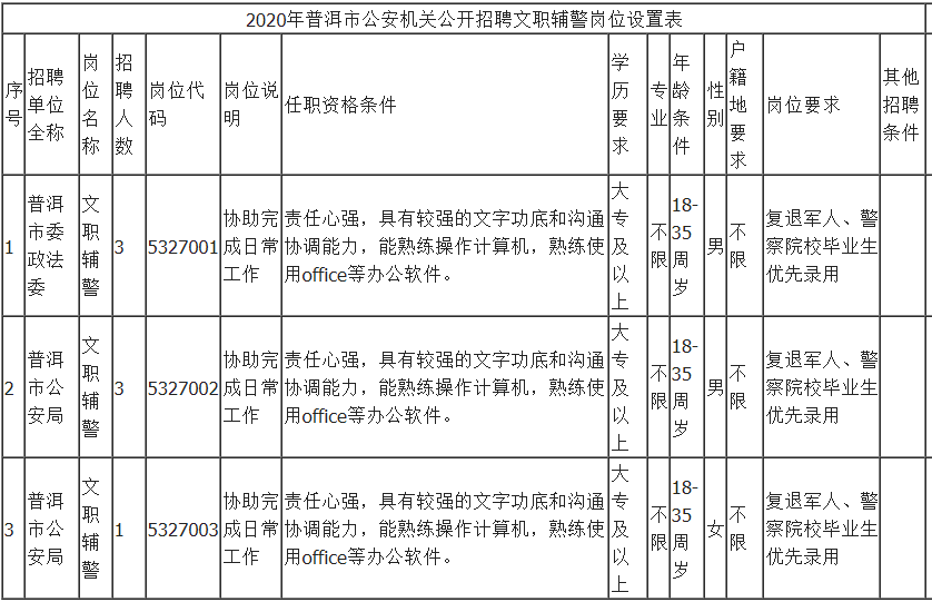 招考人数、岗位、资格条件详见《2020年普洱市公安机关公开招聘文职辅警岗位设置表》,详情请关注“普洱警方订阅号”微信公众号或登录普洱长安网(www.pecaw.gov.cn)进行查询。