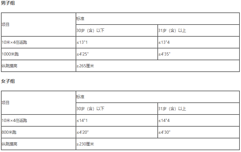 资格审核合格的人员进入体能测试,体能测试按照公安部《关于印发公安机关录用人民警察体能测评项目和标准(暂行)的通知》及其所附标准开展。