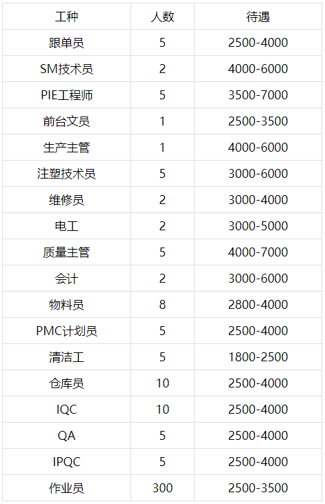 2.普工待遇:底薪1400+全勤奖+加班费(按劳动法支付);