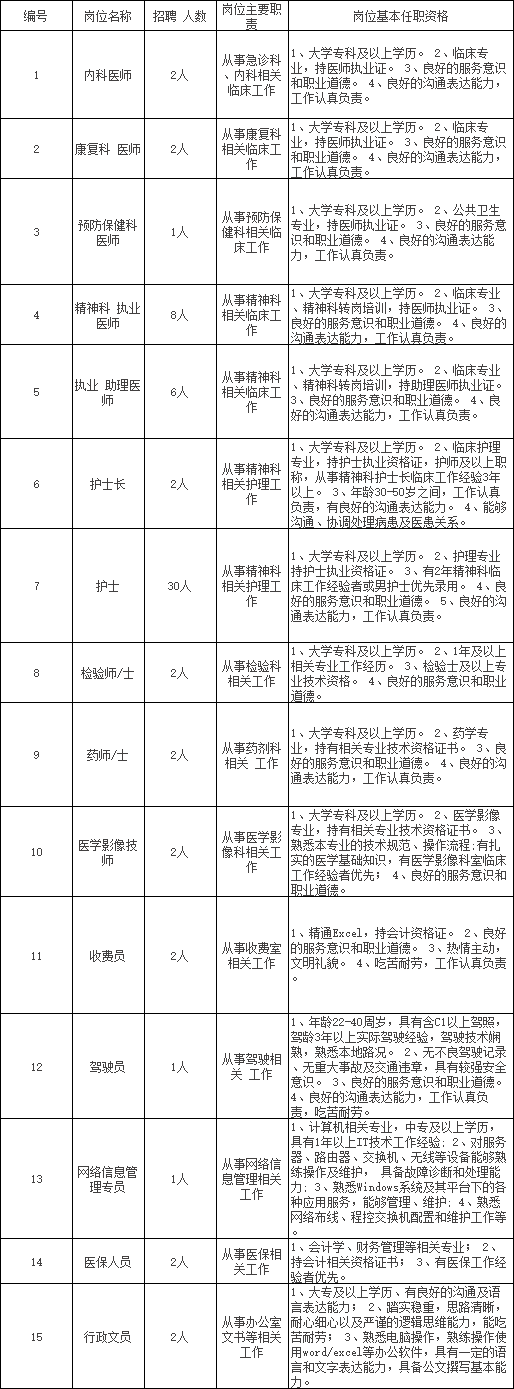 沾益鸿康医院成立于2011年7月1日,位于曲靖市沾益区龙华大道1072号(龙华中学旁),是一所一级综合医院,是沾益区严重精神障碍患者救治定点医疗机构。医院由曲靖市沾益区卫生健康局核准执业,医院业务使用面积3016平方米,主要以精神科的发展建设为中心,核定床位90张。 医院主要收治各类精神障碍患者;各类神经症患者;各类睡眠障碍患者;更年期综合症、产后精神障碍患者;老年期精神障碍患者;开展精神卫生知识宣传、心理危机干预、健康教育及精神障碍康复等工作。因业务发展需要,现招聘以下人员: