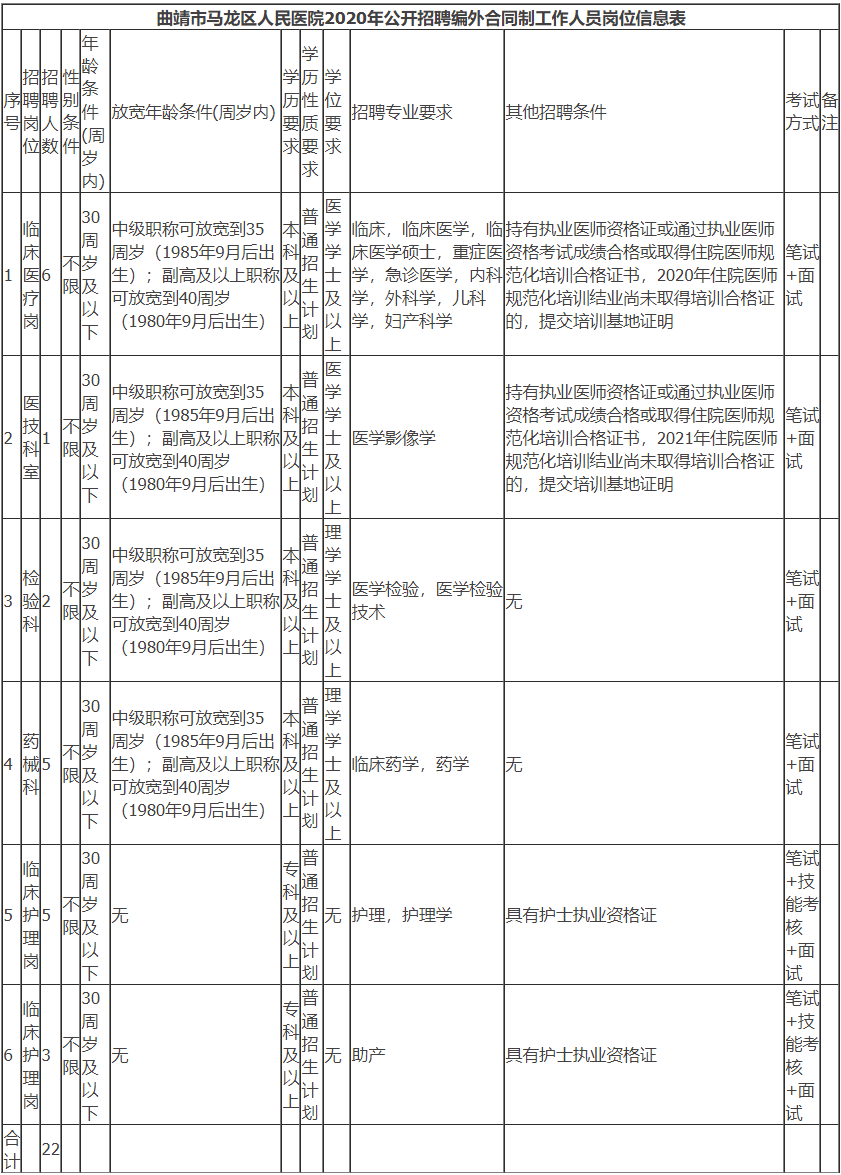 本次招聘编外合同制工作人员22人,具体岗位见《曲靖市马龙区人民医院2020年公开招聘编外合同制工作人员岗位信息表》。