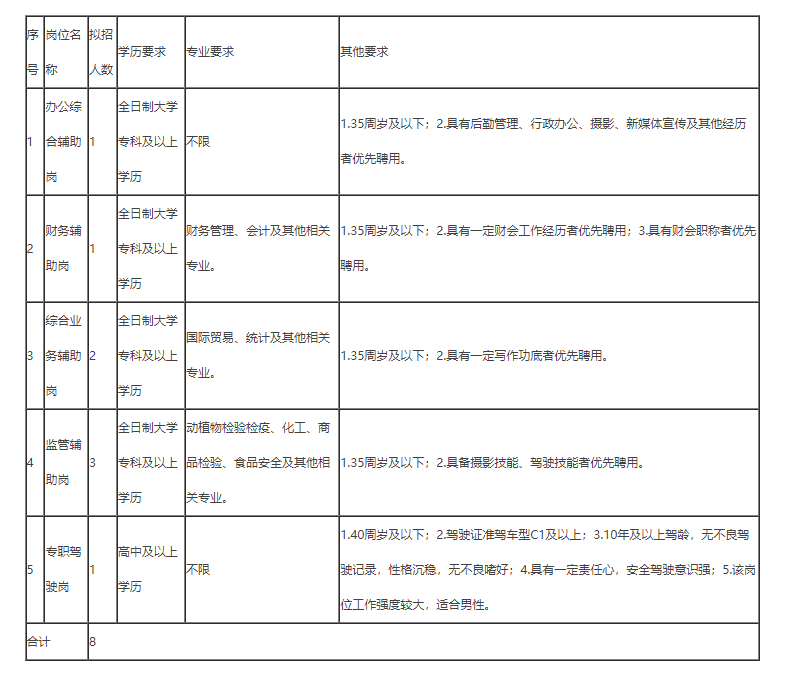 1.专业要求:财会、国际贸易、统计、动植物检验检疫、化工、商品检验、食品药品及其他相关专业;