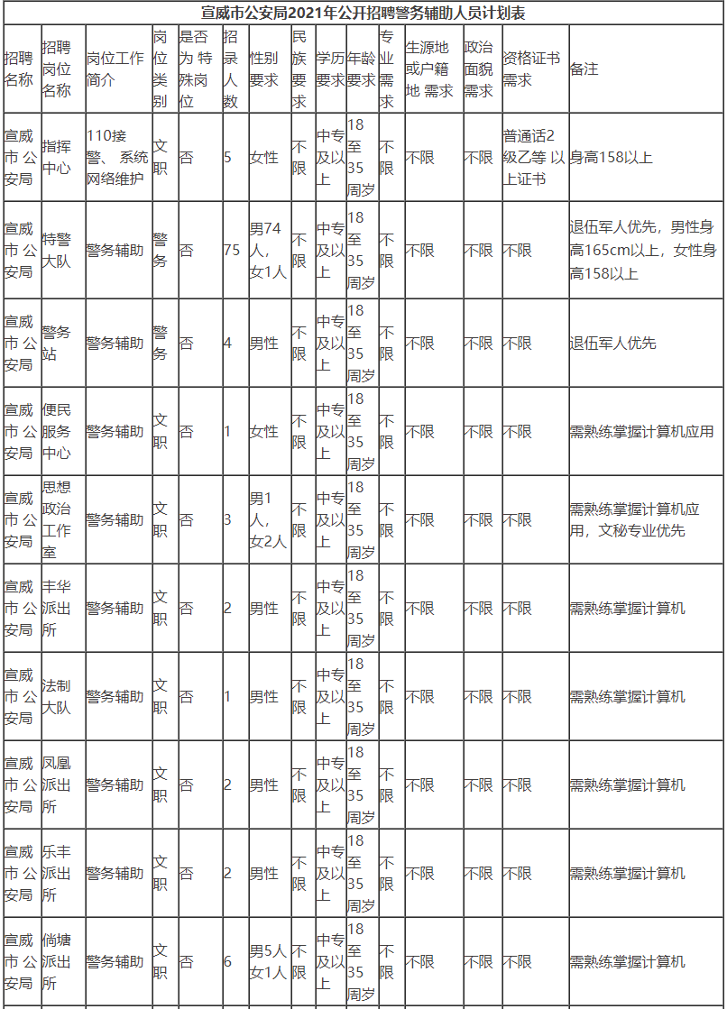 本次警务辅助人员拟招聘156人。其中:男性岗位128名,女性岗位28名。招聘条件详见《宣威市公安局2021年公开招聘警务辅助人员计划表》。