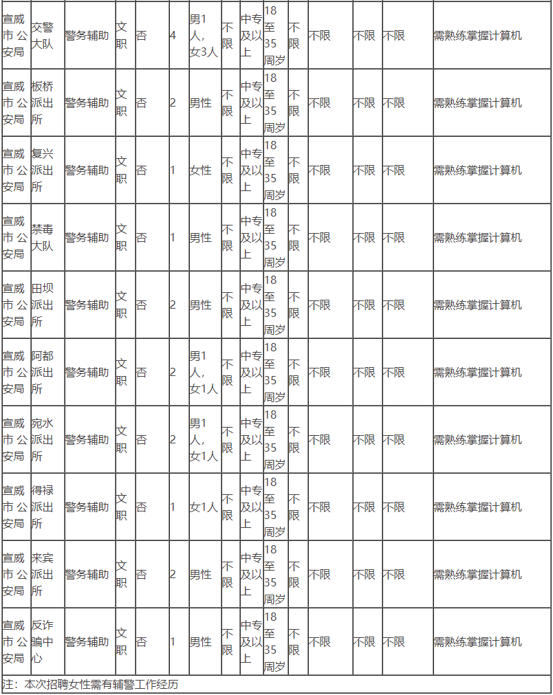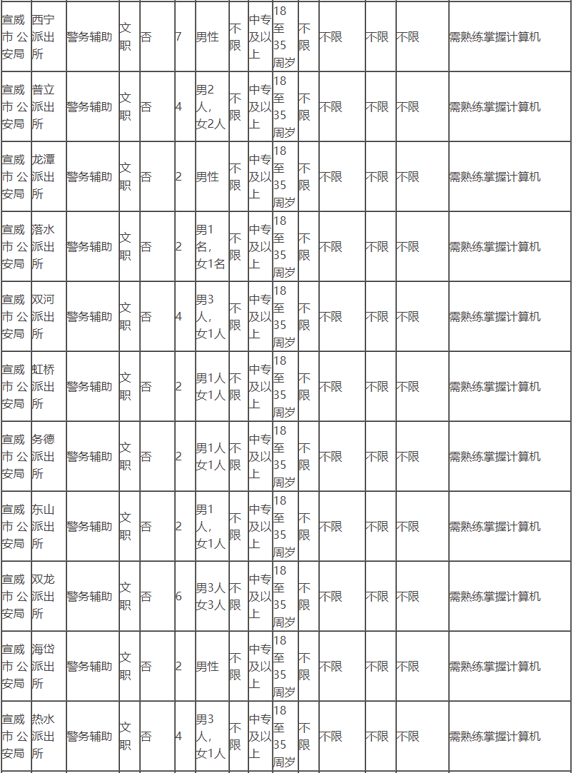 按照 《宣威市公安局机关警务辅助人员管理实施细则》的通知,为更好的完成新形势下公安工作,加强公安警务辅助力量,弥补公安警力不足现状,经宣威市公安局党委研究决定面向社会公开招聘警务辅助人员156名,现将有关事项公告如下: