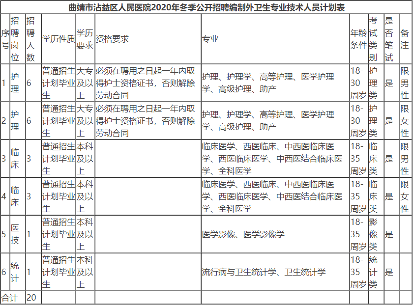 招聘岗位和名额。详见《曲靖市沾益区人民医院2020年冬季公开招聘编制外卫生专业技术人员计划表》。