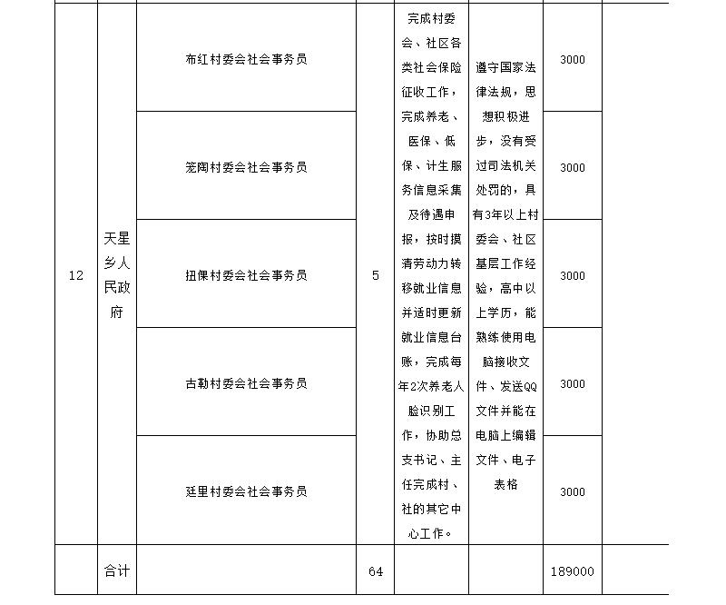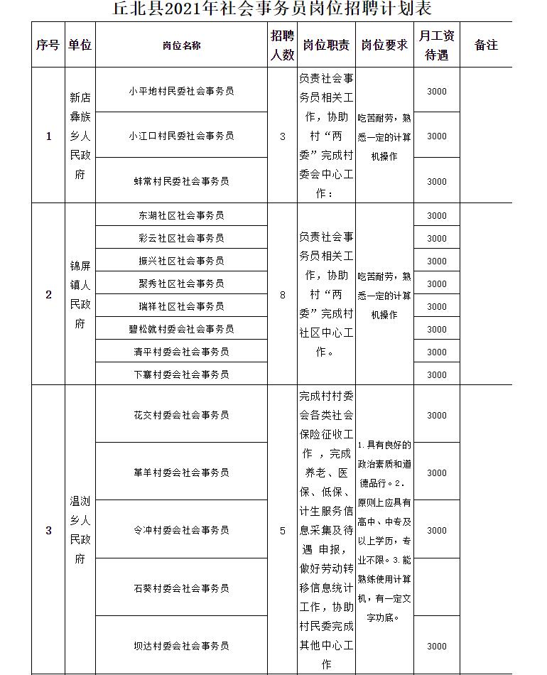 (一)本次拟向社会公开招聘64名城镇公益性岗位人员,具体岗位名称、人数、职责、要求、地点、待遇见附件1:《丘北县2021年社会事务员岗位招聘计划表》。