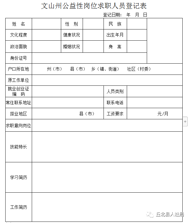 自2021年2月19日公告之日起至3月6日止,符合招聘条件的失业人员可到丘北县人力资源和社会保障局一楼大厅公共就业和人才服务中心填表报名,也可自行下载填写《文山州公益性岗位求职登记表》后到就业人才中心报名,报名交表时提供本人的《就业创业(失业)登记证》、身份证、户口册、学历证明材料等原件。资格审核与报名同时进行,资格审核主要审核报名人员是否符合城镇公益性岗位安置条件。