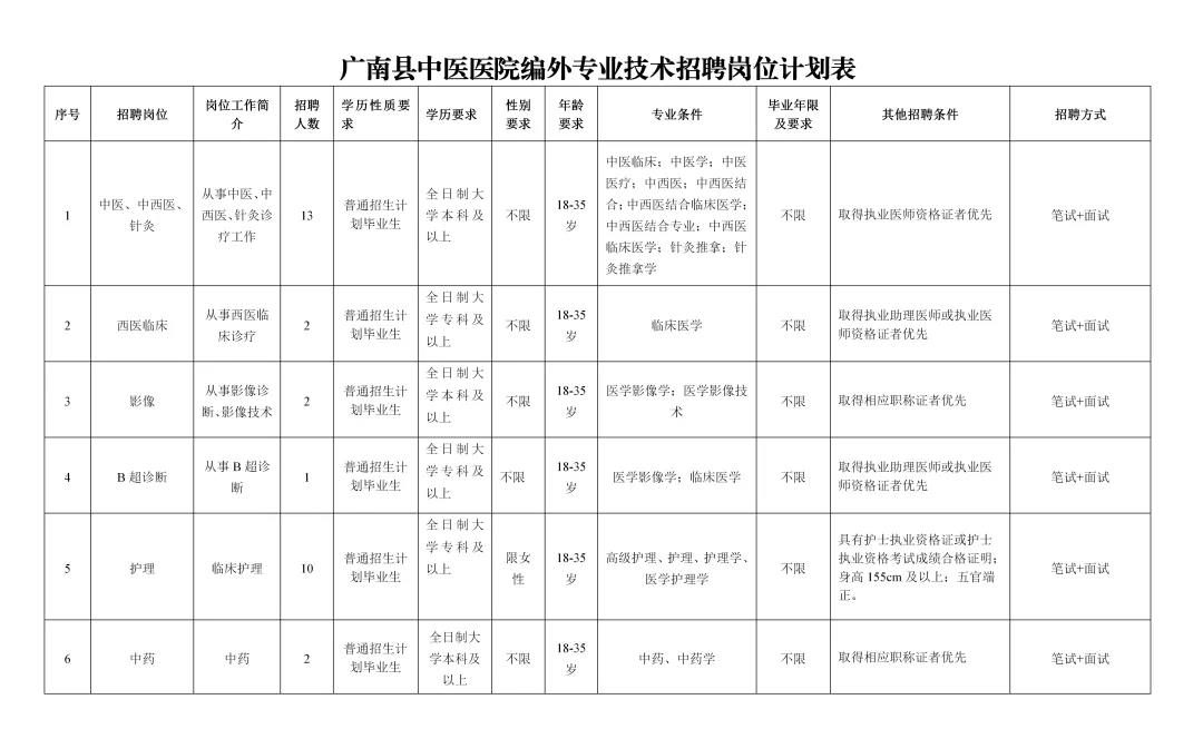 一、招聘岗位、人数、专业及资格条件:详见《广南县中医医院编外专业技术招聘岗位计划表》。