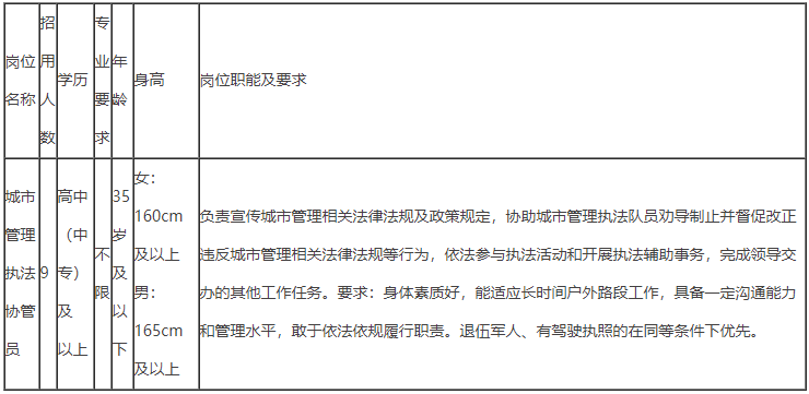 (一)招聘人数:面向社会公开招聘城市管理执法协管员9名。