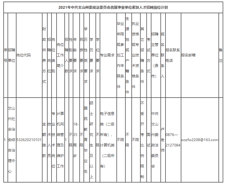 详见《2021年中共文山州委政法委员会直属事业单位紧缺人才招聘岗位计划》(附件1)