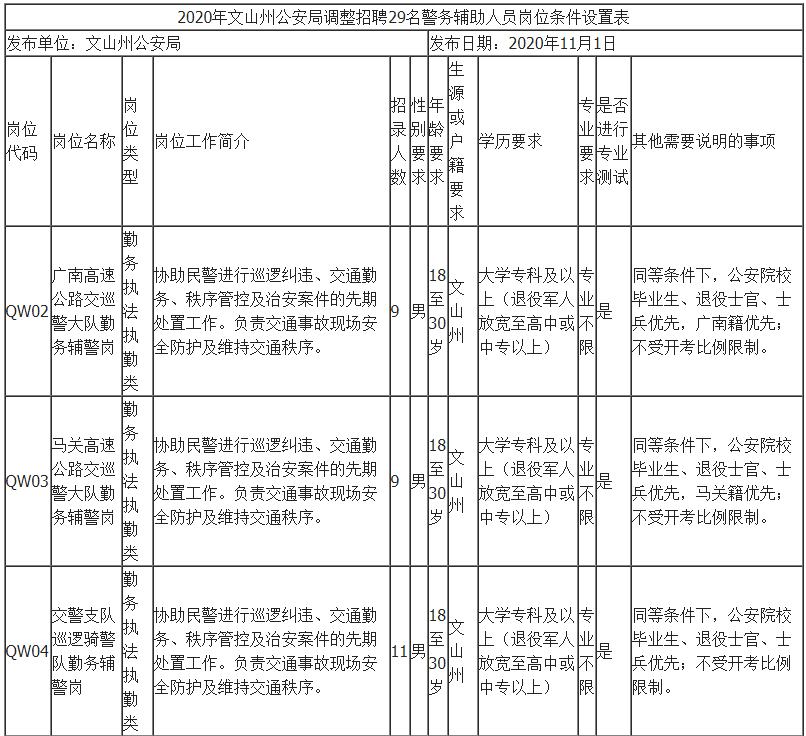 在2020年10月23日发布的《2020年文山州公安局警务辅助人员招聘公告》基础上对部分岗位设置要求进行调整。此次调整只涉及交警支队三个勤务执法执勤岗,岗位所需条件和资质详见《2020年文山州公安局调整招聘29名警务辅助人员岗位条件设置表》。