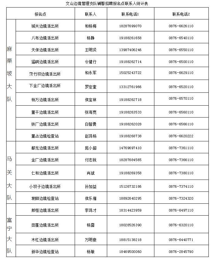 报考人员到麻栗坡、马关、富宁三边境管理大队大队部、、董占边境检查站、坡脚边境检查站、新华边境检查站或就近的边境派出所进行现场报名。联系方式如下: