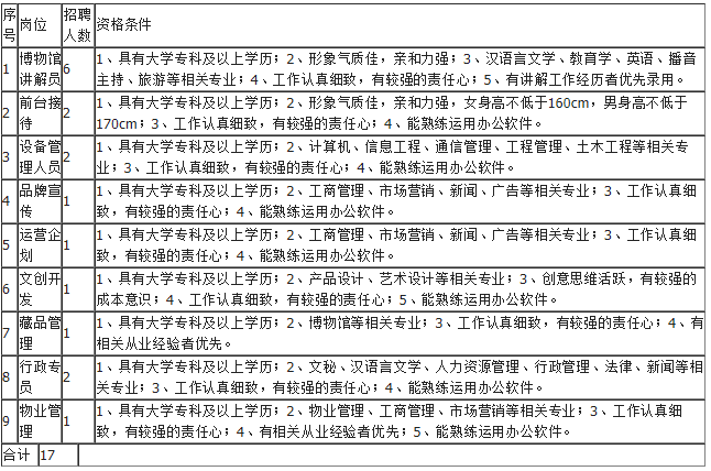 招聘工作人员17名,应聘人员在符合招聘基本条件基础上,需符合以下相关岗位应聘条件,详见下表: