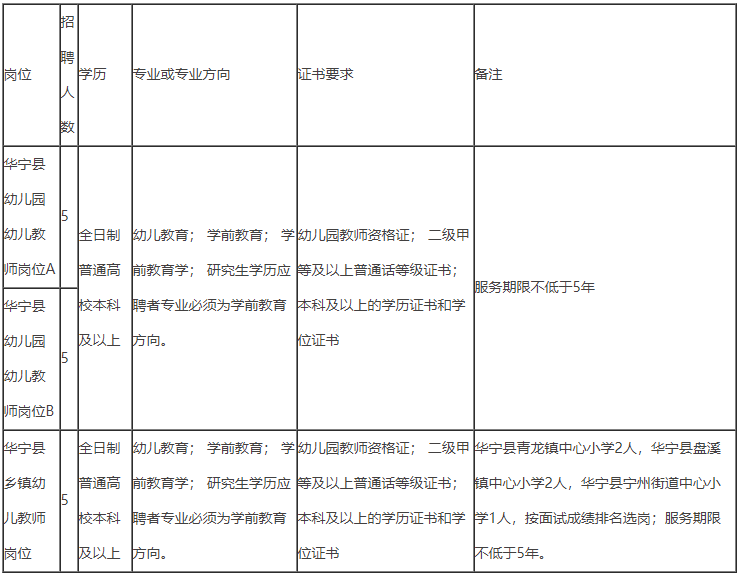 华宁县教育体育局2021年提前招聘幼儿教师岗位表
