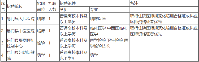 为建设一支高素质的医疗卫生健康专业人才队伍,促进全县医疗卫生健康事业发展,根据《玉溪市建立县域医疗卫生共同体人员统筹使用机制的指导意见(试行)》(玉人社发〔2020〕83号)、《中共玉溪市委组织部玉溪市人力资源和社会保障局 关于进一步规范玉溪市事业单位公开招聘工作的实施意见》和《中共玉溪市委组织部 中共玉溪市委机构编制办公室 玉溪市人力资源和社会保障局 关于规范玉溪市事业单位提前招聘人员工作的通知》(玉人社发〔2019〕91号)等文件精神,结合我县医疗卫生健康事业发展的需要,经易门县卫生健康系统提前招聘医药专业人才工作领导小组研究决定,提前招聘4名医药专业人才。现将招聘有关事项公告如下: