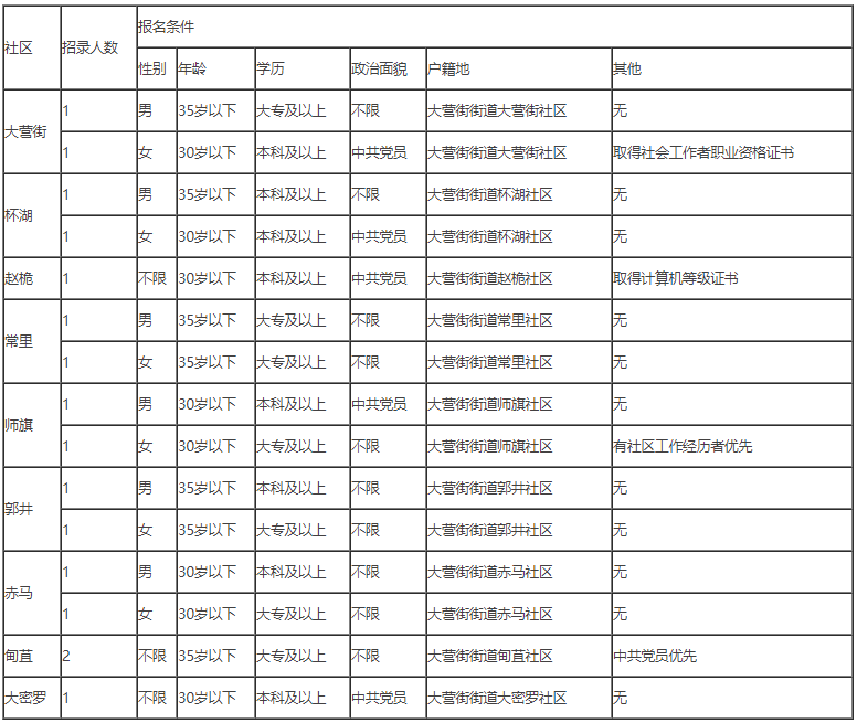 社区招录人数报名条件性别年龄学历政治面貌户籍地其他大营街1男35岁以下大专及以上不限大营街街道大营街社区无1女30岁以下本科及以上中共党员大营街街道大营街社区取得社会工作者职业资格证书杯湖1男35岁以下本科及以上不限大营街街道杯湖社区无1女30岁以下本科及以上中共党员大营街街道杯湖社区无赵桅1不限30岁以下本科及以上中共党员大营街街道赵桅社区取得计算机等级证书常里1男35岁以下大专及以上不限大营街街道常里社区无1女35岁以下大专及以上不限大营街街道常里社区无师旗1男30岁以下本科及以上中共党员大营街街道师旗社区无1女30岁以下大专及以上不限大营街街道师旗社区有社区工作经历者优先郭井1男35岁以下本科及以上不限大营街街道郭井社区无1女35岁以下大专及以上不限大营街街道郭井社区无赤马1男30岁以下本科及以上不限大营街街道赤马社区无1女30岁以下大专及以上不限大营街街道赤马社区无甸苴2不限35岁以下大专及以上不限大营街街道甸苴社区中共党员优先大密罗1不限30岁以下本科及以上中共党员大营街街道大密罗社区无